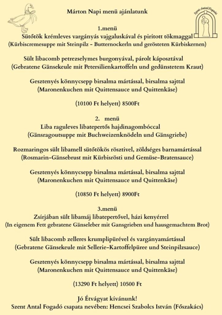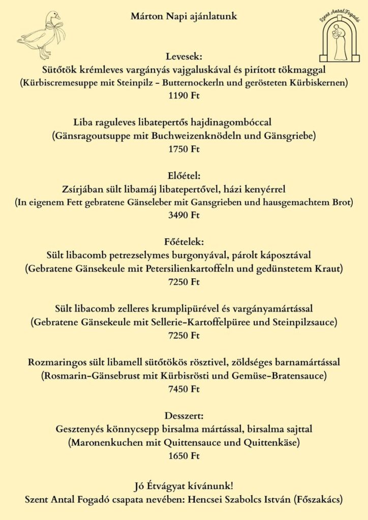 Kezdetben egy nagyon szűk étlappal kezdtünk, amelyen az étkek – a vendégkör ízlésének kitapasztalása alapján – mindig változtak. Félévente, évente kerültek le ill. fel ételek, így 2005. nyarára egy – az előételektől a salátákig – 180 féle ételt kínáló étlapunk lett. Az étlapot ünnepi hétvégeken vagy egyéb alkalmakkor – Márton nap, húsvét, pünkösd, torkos csütörtök… – kiegészítjük ünnepi menü-ajánlattal, amely alkalmanként 15-20 féle – az ünnep tartalmához illő ételspecialitást tartalmaz..